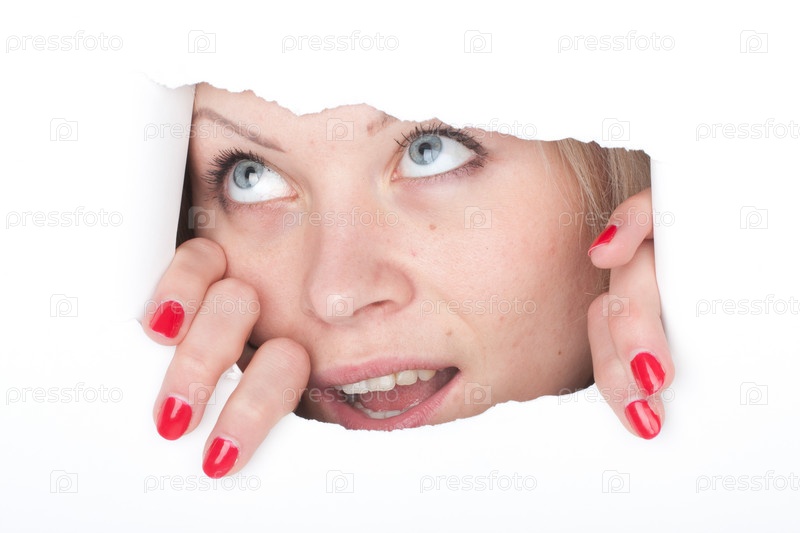 Девушка выглядывает из-за рваного отверстия в белой бумаге