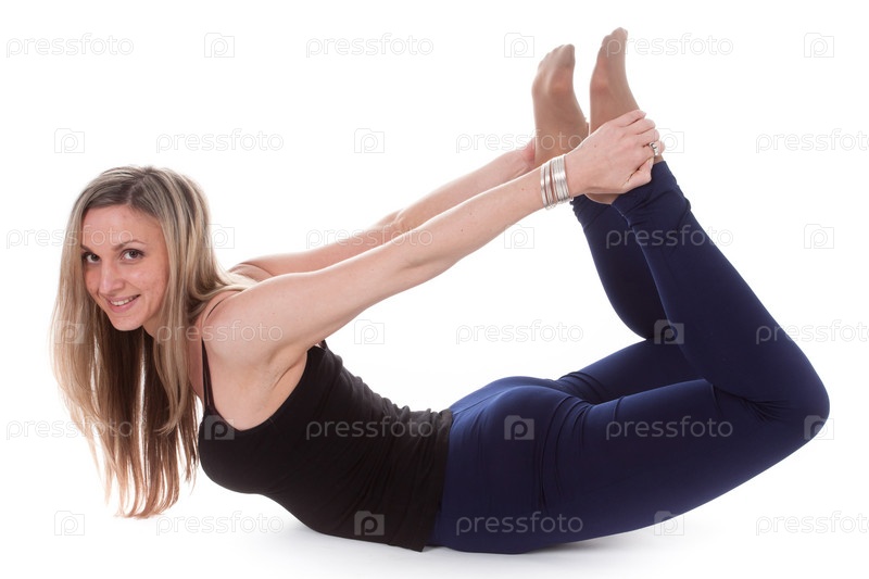 Девушка занимается гимнастикой на белом фоне
