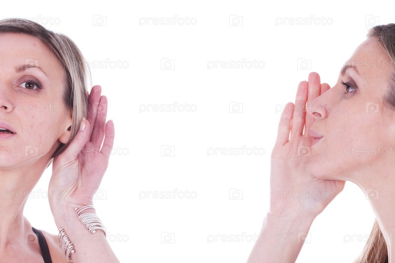 Одна девушка прислушивается, а вторая девушка что-то ей шепчет, белый фон