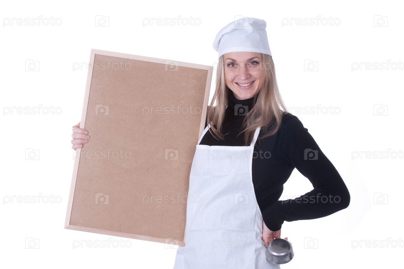 Женщина-повар с деревянной доской на белом фоне