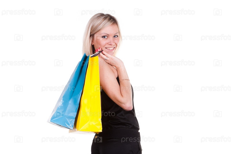Девушка в черном платье с покупками на белом фоне