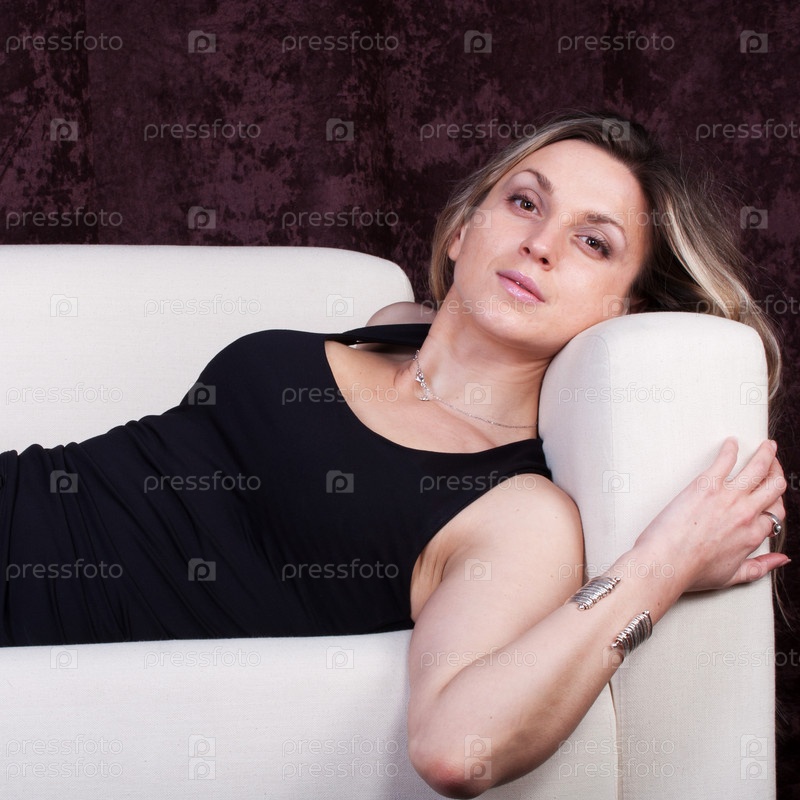 Девушка в черном платье, лежащая на диване