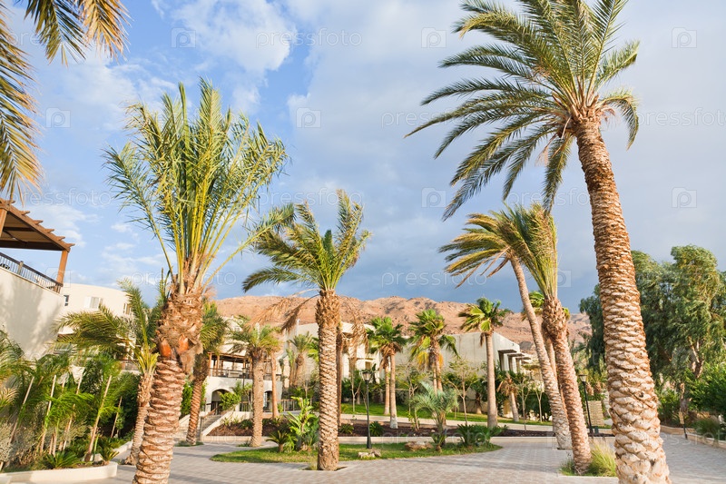 Пальмовые деревья на ветру в курортном отеле на Мертвом море, Иордания