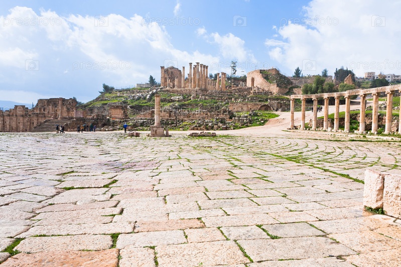 Колоннада на древнеримском овальном форуме в античном городе Джераш, Иордания