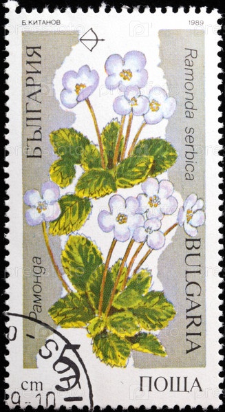 Почтовая марка Болгарии 1989 года с изображением цветка-рамонды сербской