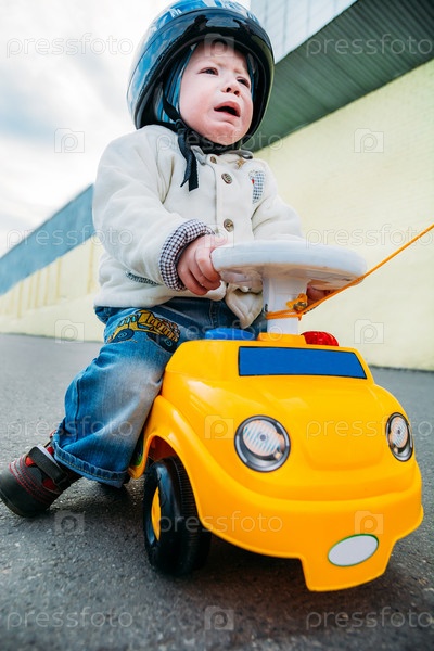 Маленький мальчик на игрушечном автомобиле