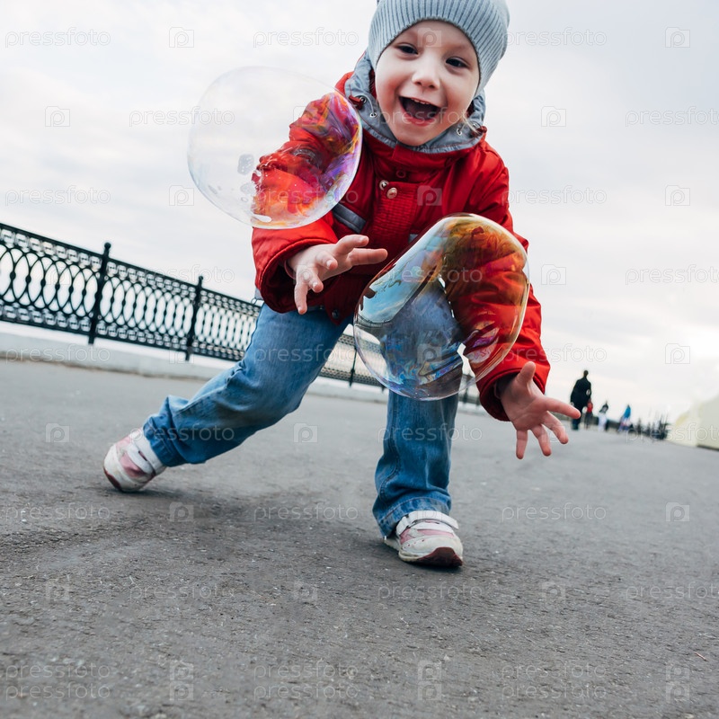 Маленькая девочка ловит мыльные пузыри
