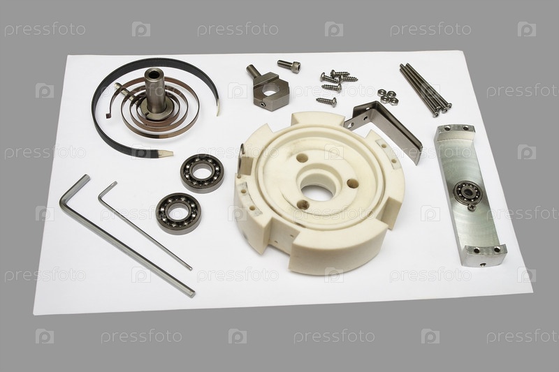 Части разобранного потенциометра на белой доске на сером фоне