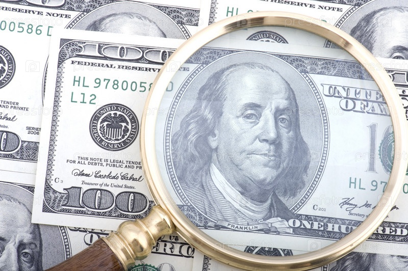 Объект на белом - валютный лупа с деньгами