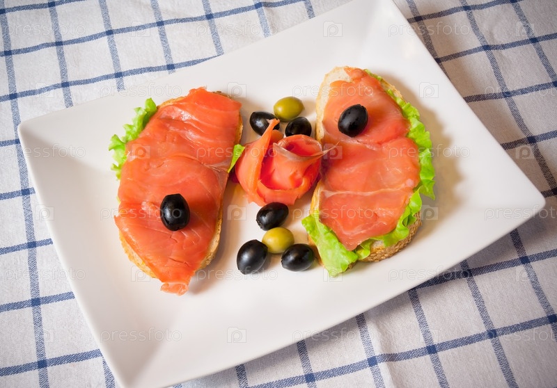 Бутерброды с лососем, салатом и оливками
