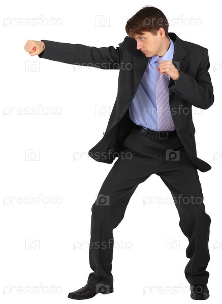 Бизнесмен изолированно бьет кулаками на белом фоне