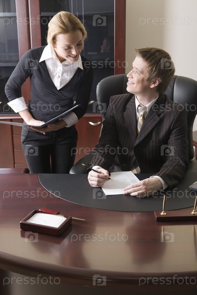 Красивая девушка с папкой в руках и мужчина, сидящий за столом и подписывающий документ
