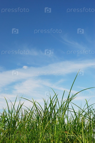 Зеленая трава на фоне синего неба
