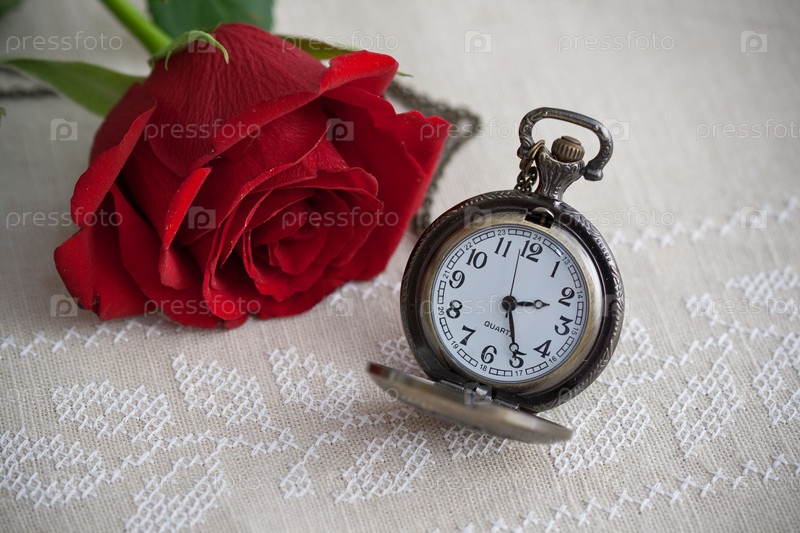 Красная роза и карманные часы на салфетке, вышитой крестиком