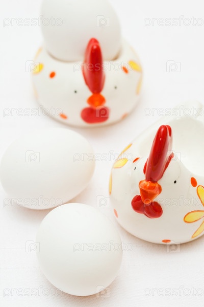 Белые яйца и подставки для яиц на белом фоне