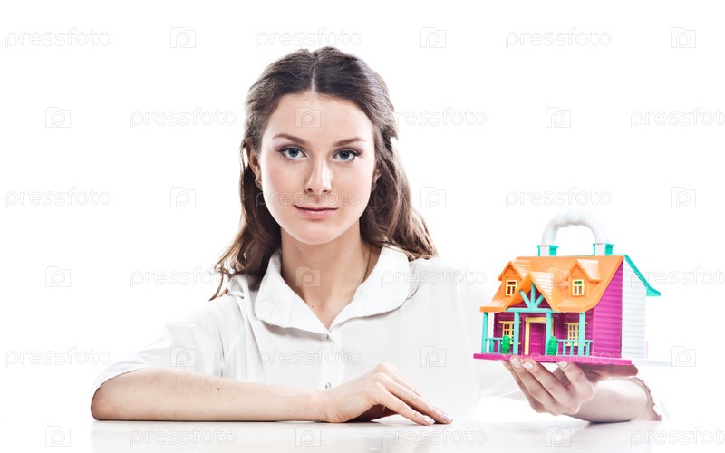 Молодая женщина с игрушечным домиком на белом фоне