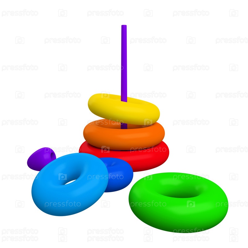 Разобранная разноцветная игрушечная пирамида, изолированная на белом фоне