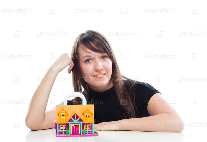 Портрет молодой и красивой девушки с макетом загородного дома