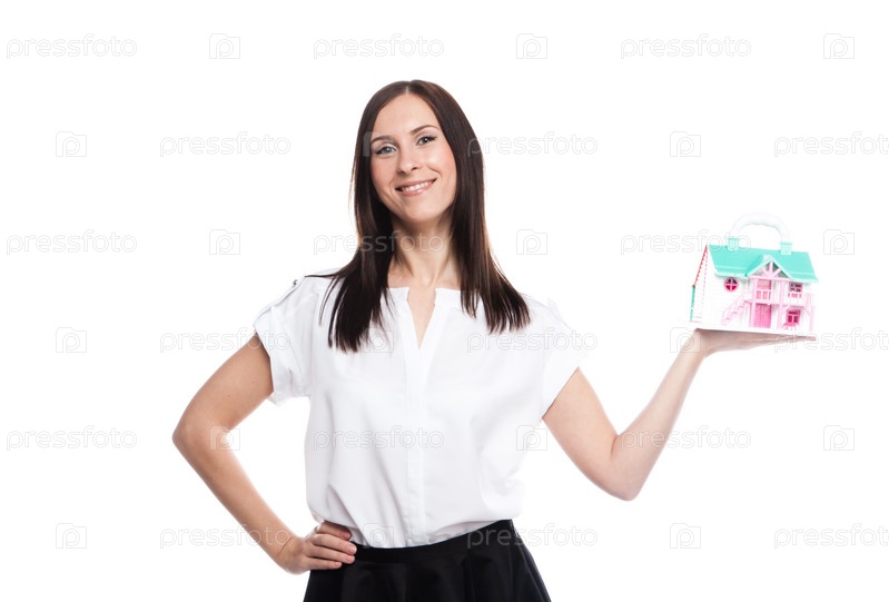 Портрет молодой красивой девушки с макетом загородного дома