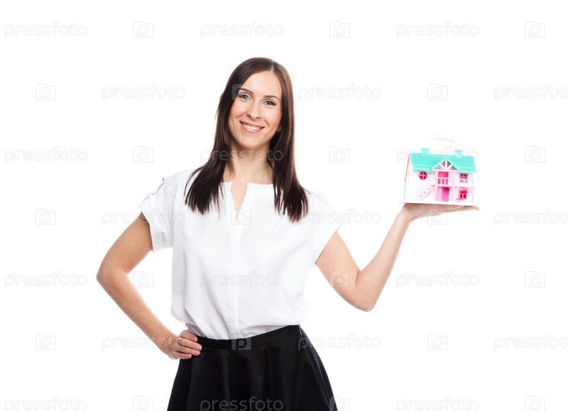 Портрет молодой и красивой девушки с макетом загородного дома