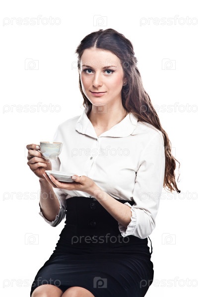 Успешная деловая девушка пьет кофе из белой фарфоровой чашки