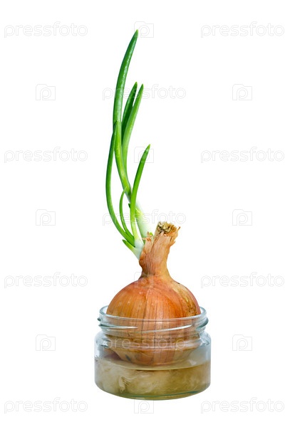 Пророщенная луковица в баночке с водой, изолированная на белом фоне