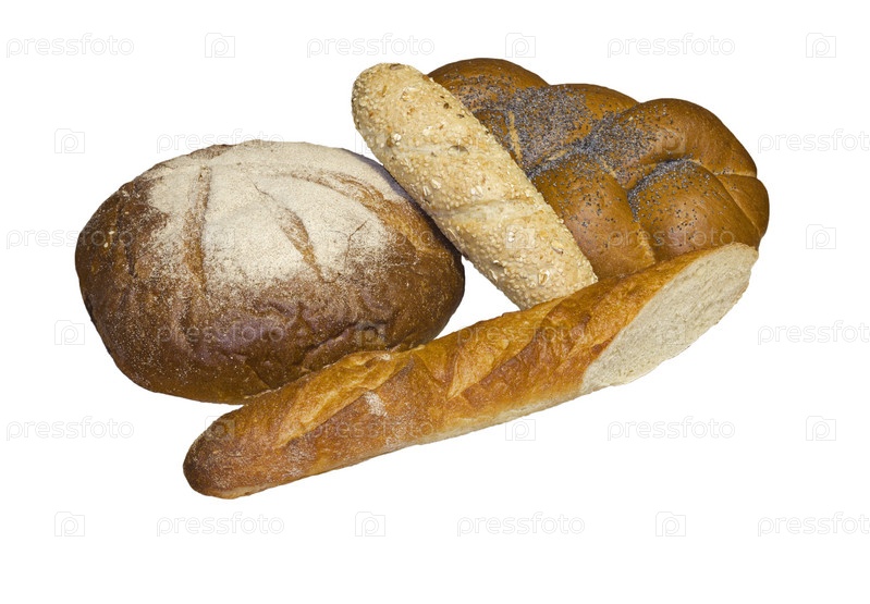 Черный хлеб, батон с маком и два багета на льняной салфетке, белый фон