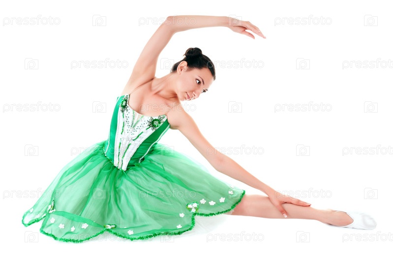 Балерина в зеленом платье на белом фоне