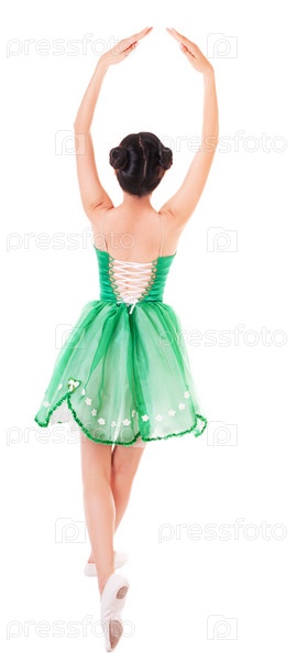Балерина в зеленом платье на белом фоне