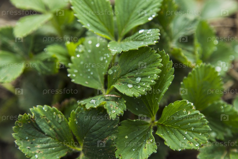 Листья клубники с каплями воды