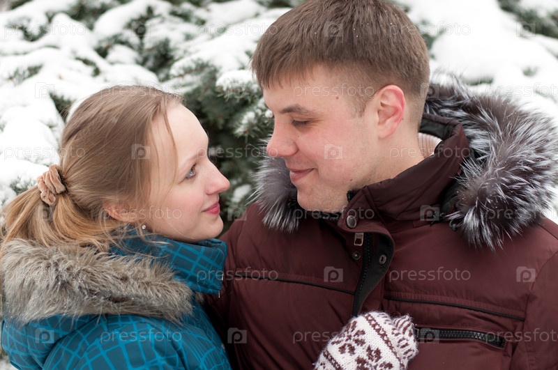 Счастливая молодая пара зимой на свежем воздухе