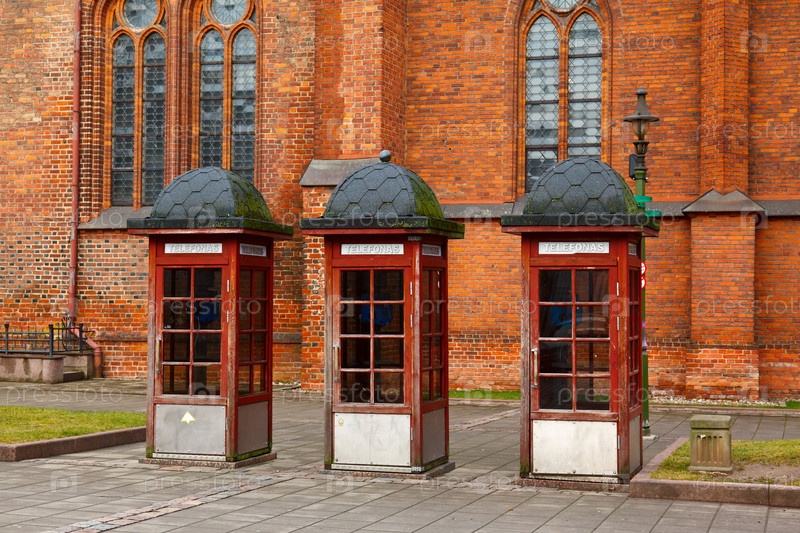 Три старых деревянных телефонных кабины в старом городе