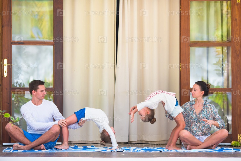 Семья занимается йогой