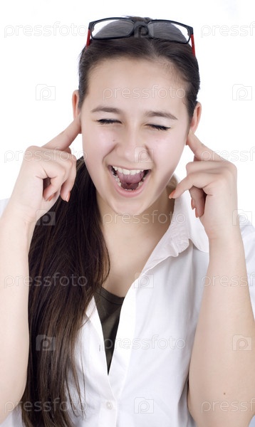 Девушка кричит и закрывает уши на белом фоне