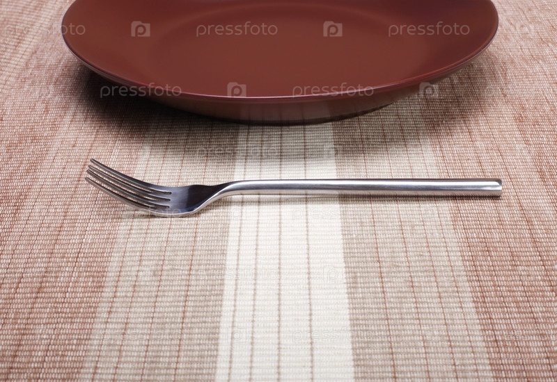 Пустая коричневая тарелка и вилка на скатерти