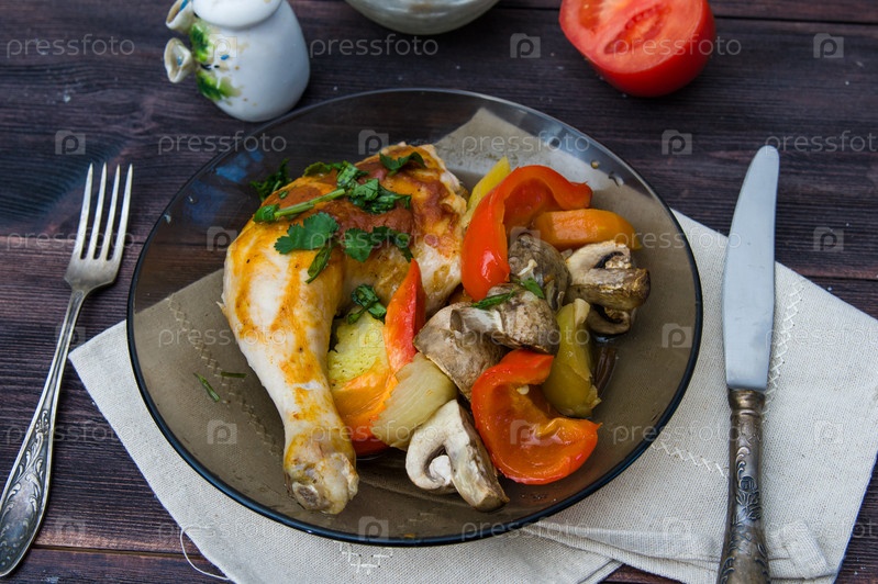Жареная курица с грибами и овощами