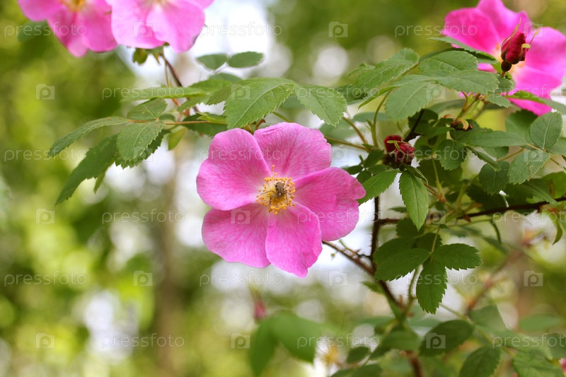 Цветок шиповника на фоне зеленых листьев