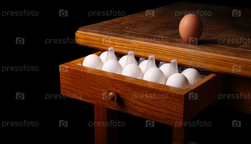 Белые яйца в ящике и коричневое на столе
