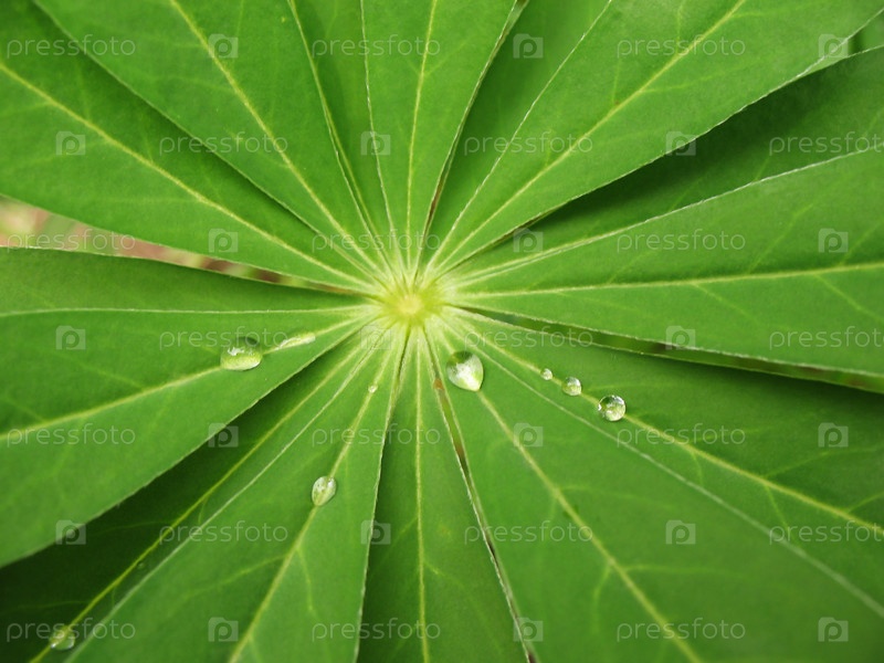 Лист люпина (Lupinus), семейства бобовых, с капельками дождя