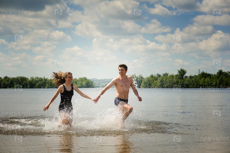 Молодая пара бежит в воде