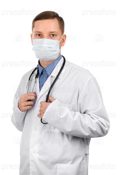 Молодой врач в маске, изолированный на белом фоне