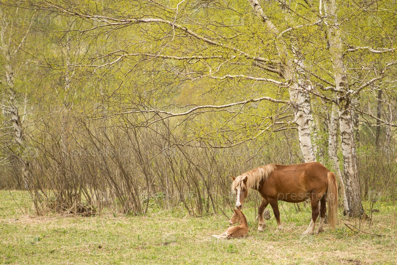 Лошадь и жеребенок на лугу