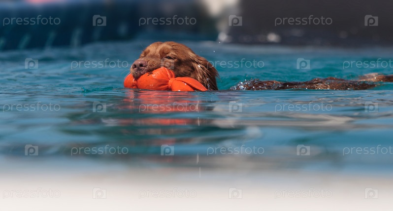 Пес плавает в бассейне