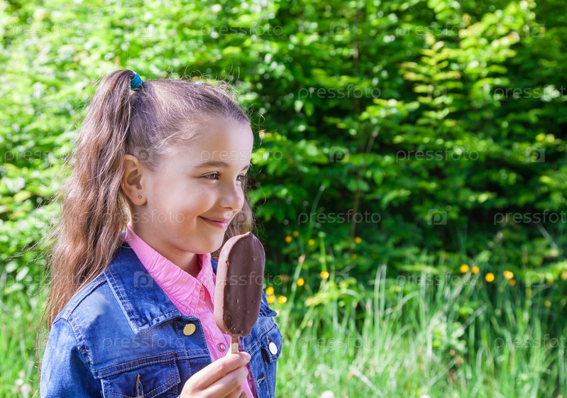 Улыбающаяся девочка ест мороженое