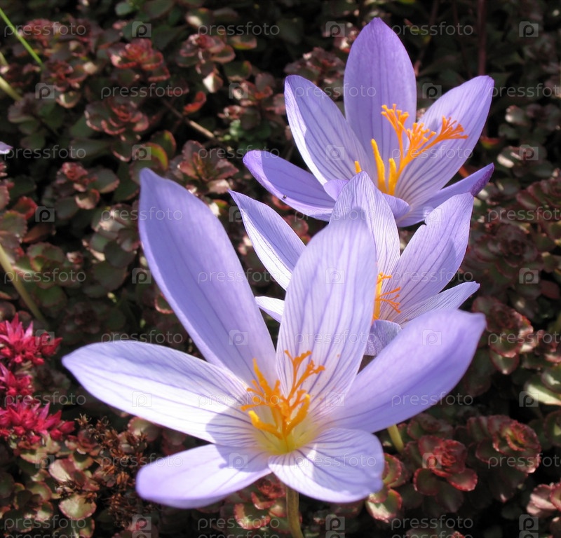 Колхикум или бесвременник (Colchicum), семейство безвременников, на фоне седума (sedum)