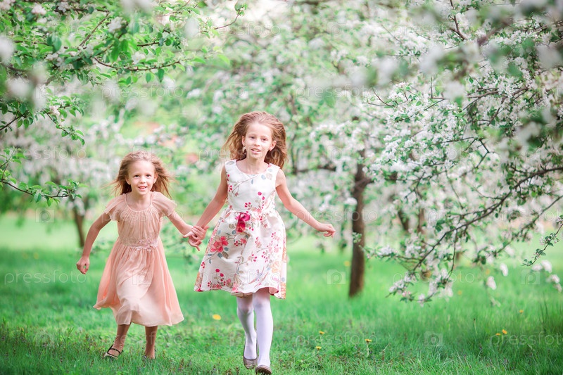 Очаровательные девочки в цветущем саду