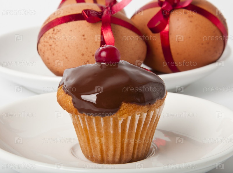 Кекс с шоколадной глазурью и пасхальные яйца