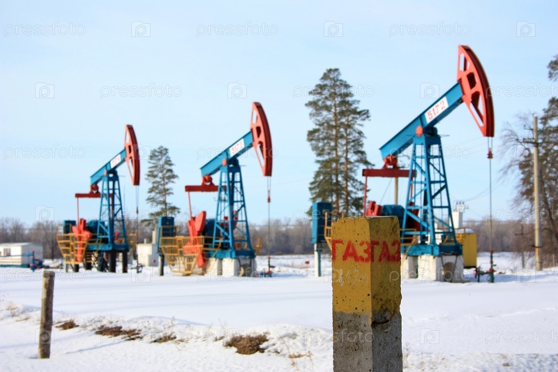 Столб с надписью "Газ" на фоне нефтяных качалок