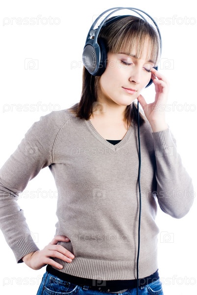 Молодая женщина в наушниках на белом фоне