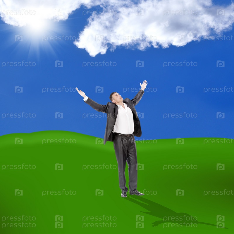 Счастливый бизнесмен на фоне зеленого луга и голубого солнечного неба
